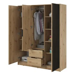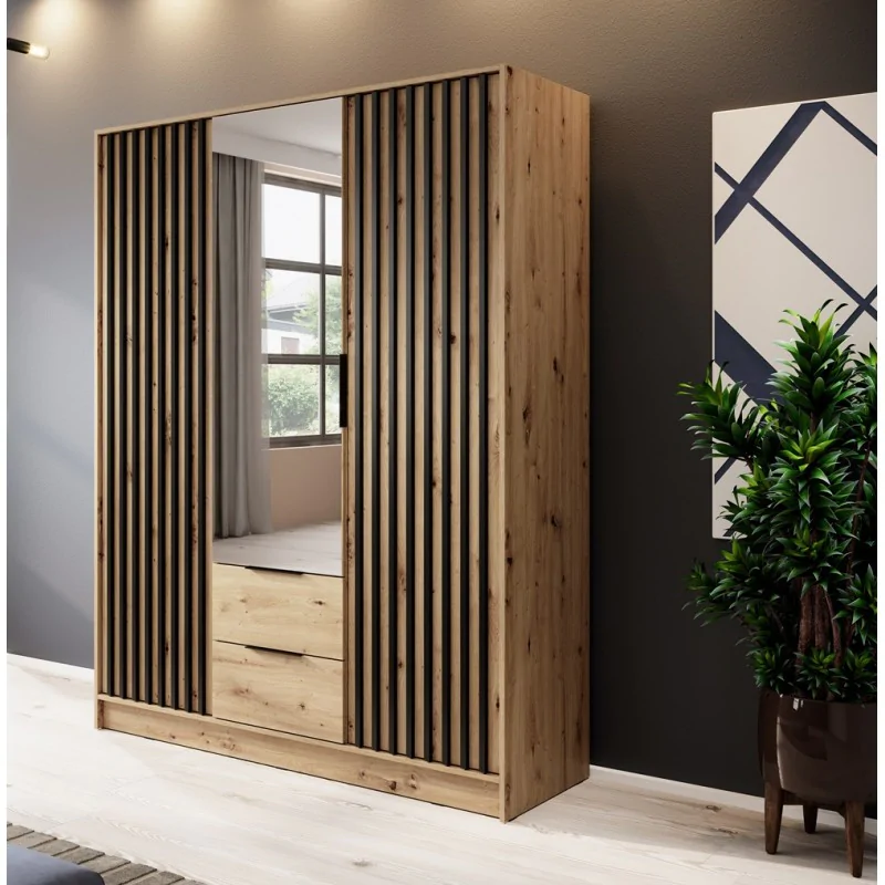 Szafa Kelly z lustrem sprawdzi się zarówno w sypialni jaki i przedpokoju, gdzie stworzy dodatkowe miejsce do przechowywania, nie tylko ubrań. Dzięki dekoracyjnym lamelom na froncie, szafa wyróżnia się niepowtarzalnym wyglądem. Mebel jest bardzo funkcjonalny i pojemny. Posiada dwie szuflady, drążek na wieszaki oraz dwie zamykane szafki z półkami w środku. Wysokość półek środkowych jest regulowana, co pozwala na dostosowanie ich do własnych potrzeb.