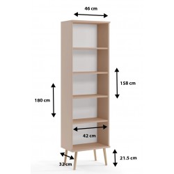 Połączenie minimalistycznego designu i lekkiej formy idealnie wkomponuje się do wnętrz nowoczesnych i z klasą, nadając pomieszczeniu subtelnego piękna. Wysokie nóżki z litego drewna i wyjątkowa kolorystyka płyty doskonale się razem komponuje oraz sprawia, że mebel jest niepowtarzalny i gustowny. Mebel został wykonany z płyty meblowej o grubości 18 mm, dzięki czemu posłuży przez długie lata. Regał zawiera 4 półek, z których 2 posiadają regulację wysokości. Staranne wykonanie, najwyższa jakość użytych materiałów, oraz dbałość o najmniejszy szczegół to największe atuty tego mebla.