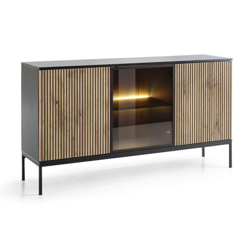 Kolekcja SANTI to stylowe meble z frontami 3D z bardzo modnymi lamelami w kolorze dębu w połączeniu z klasyczną czernią tworzą przepiękny kontrast. Naturalna barwa drewna nadaje meblowi niepowtarzalnego uroku, wprowadzając do wnętrza nutę elegancji i przytulności. Korpus szafki utrzymany jest w kolorze czarnym co kontrastuje z frontami dodając wyjątkowego charakteru. Oświetlenie LED podkreśla nowoczesność i atrakcyjność mebla. Komoda posiada nie tylko wyjątkowy wygląd, ale także funkcjonalność dzięki szafkom za którymi znajdują się półki do przechowywania. Środkowy front komody wyposażony został w hartowane szkło antisol czarny, osadzone w aluminiowej ramce dodaje meblu wyrafinowanego wyglądu który zachwyci każdego. Kolekcja SANTI to meble modułowe dzięki czemu można je kompletować według własnego uznania.