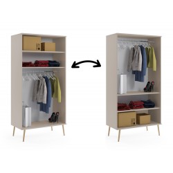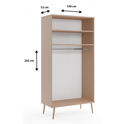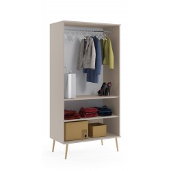 Połączenie minimalistycznego designu i lekkiej formy idealnie wkomponuje się do wnętrz nowoczesnych i z klasą, nadając pomieszczeniu subtelnego piękna. Wysokie nóżki z litego drewna, sznurkowe uchwyty i wyjątkowa kolorystyka płyty doskonale się razem komponuje oraz sprawia, że mebel jest niepowtarzalny i gustowny. W szafie zastosowano zawiasy z cichym domykiem oraz płytę meblową o grubości 18 mm, dzięki czemu posłuży przez długie lata. Szafa zawiera 2 półki i poprzeczkę na wieszaki. Konfiguracja szafy jest dowolna i pozwala na usytuowanie półek w górnej lub dolnej części. Staranne wykonanie, najwyższa jakość użytych materiałów, oraz dbałość o najmniejszy szczegół to największe atuty tego mebla.