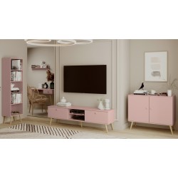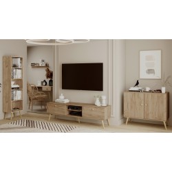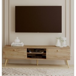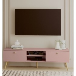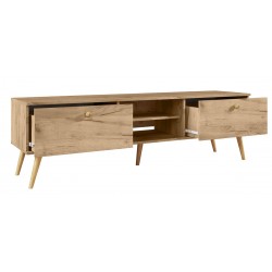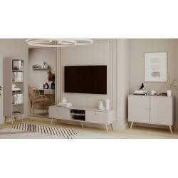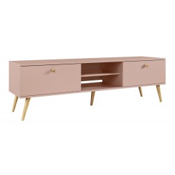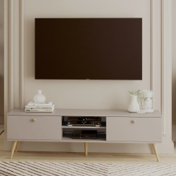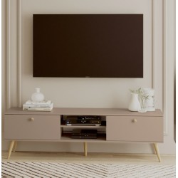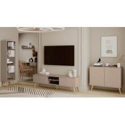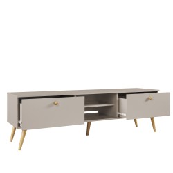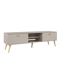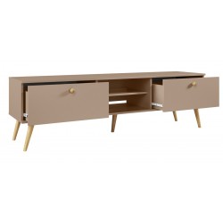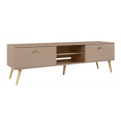 Połączenie minimalistycznego designu i lekkiej formy idealnie wkomponuje się do wnętrz nowoczesnych i z klasą, nadając pomieszczeniu subtelnego piękna. Wysokie nóżki z litego drewna, sznurkowe uchwyty i wyjątkowa kolorystyka płyty doskonale się razem komponuje oraz sprawia, że mebel jest niepowtarzalny i gustowny. W szafce rtv zastosowano zawiasy z cichym domykaniem oraz płytę meblową o grubości 18 mm, dzięki czemu posłuży przez długie lata. Mebel posiada otwór do przełożenia kabli. Staranne wykonanie, najwyższa jakość użytych materiałów, oraz dbałość o najmniejszy szczegół to największe atuty tego mebla.