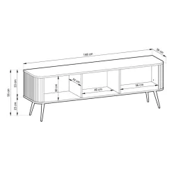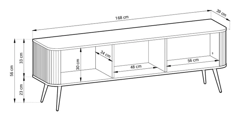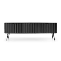 Nowoczesna szafka rtv ZOJA jest niezwykle stylowa, elegancka i funkcjonalna. Trzy pojemne zamykane szafki, pomieszczą niezbędne przedmioty i akcesoria oraz pozwolą uporządkować przestrzeń w salonie. Mebel wyróżnia się zaokrąglonymi krawędziami, ryflowanymi frontami oraz wysokimi metalowymi nóżkami w kolorze czarnym lub złotym. Szafka została wykonana z wysokiej jakości polskich produktów co daje gwarancję niezawodności i wysokiego standardu wykonania mebla.