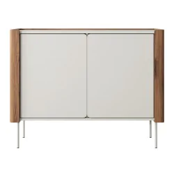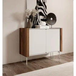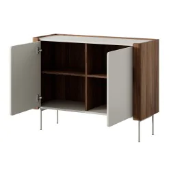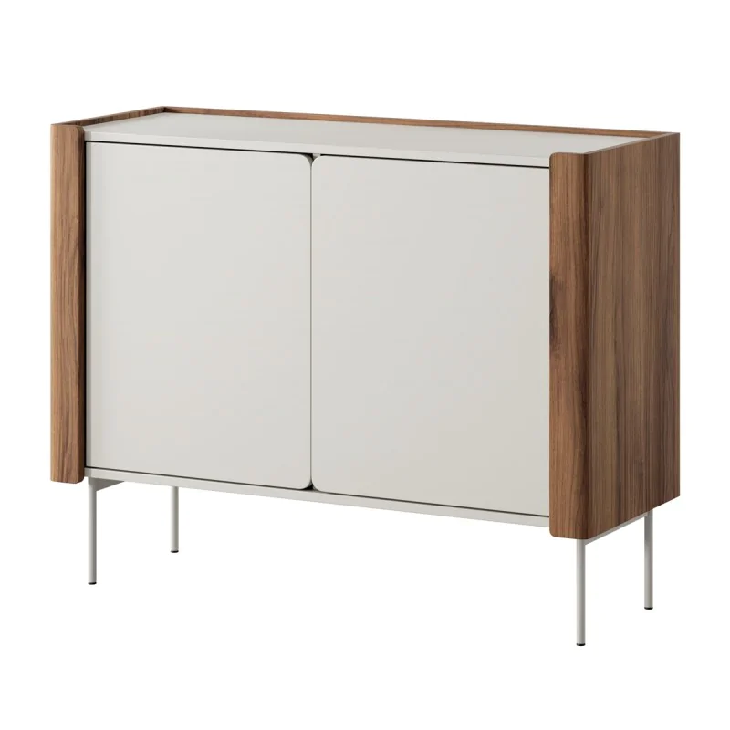 Komoda WRAPSO to nowoczesny i funkcjonalny mebel. Posiada dwie zamykane szafki z półką w środku. Minimalistyczny design bez uchwytów, podkreśla oryginalny charakter komody, zapewniając wygodę podczas użytkowania. Zaokrąglone narożniki na frontach i bokach dodają atrakcyjności oraz zwiększają bezpieczeństwo, zwłaszcza w domach w których są dzieci. Metalowe wysokie nogi nadają lekkości i stabilności, podkreślając nowoczesny styl.